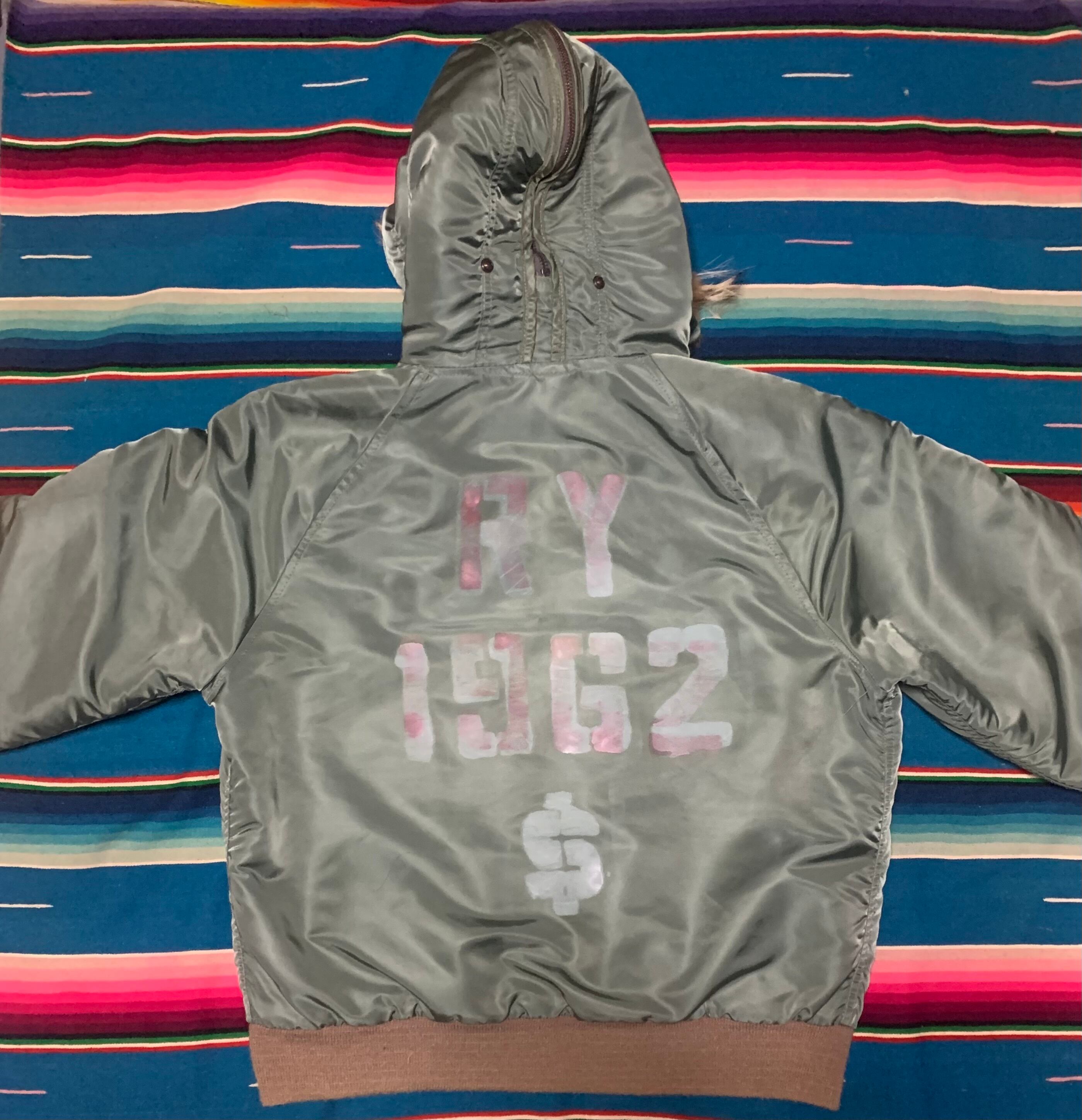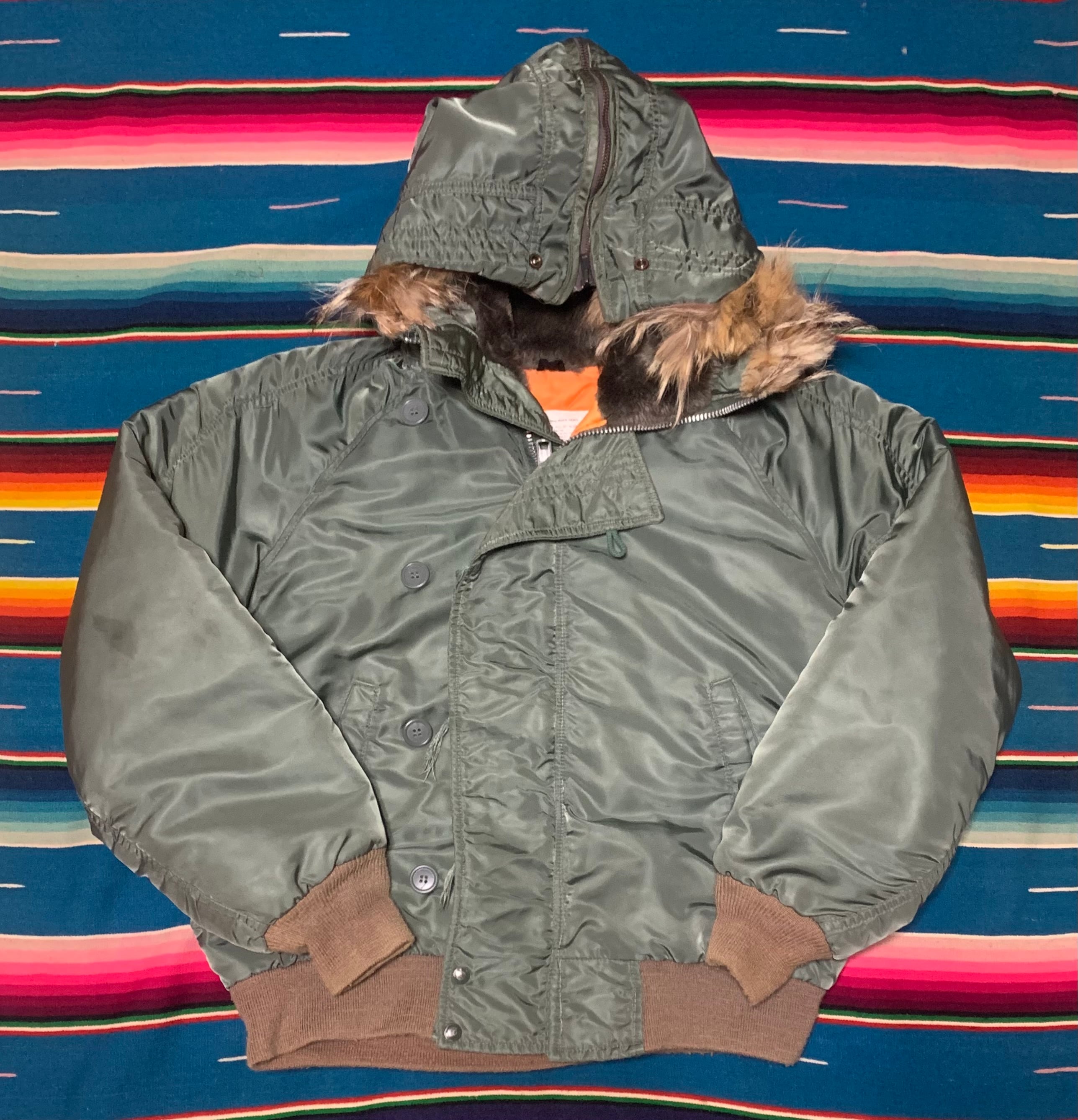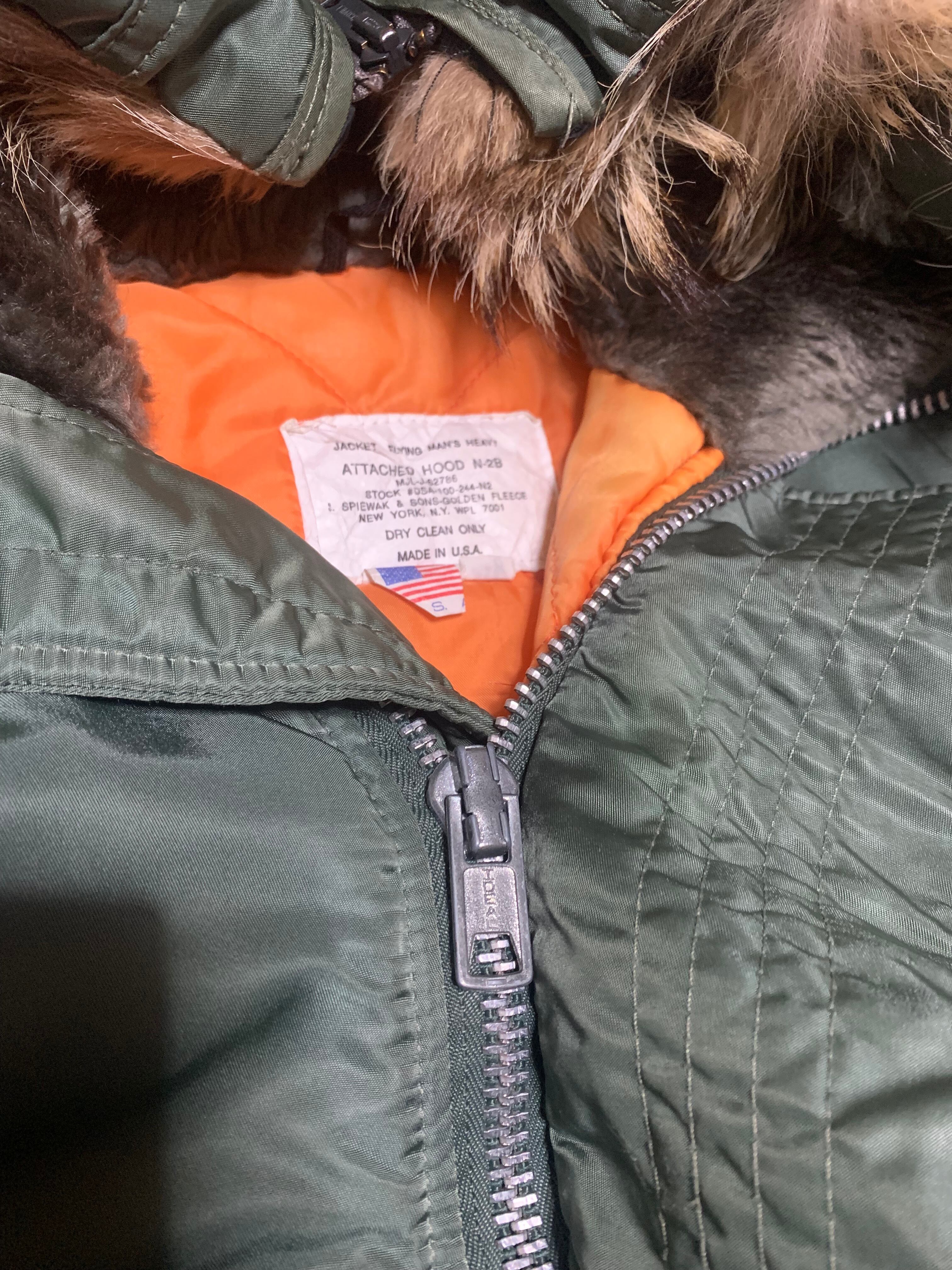 スピワック ゴールデンフリースのN2-Bフライトジャケットで、フロントジッパーはIDEAL、フードジッパーはSCOVILLになっております。またバックにペイントの痕跡が御座います。